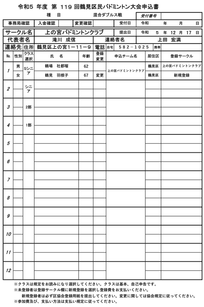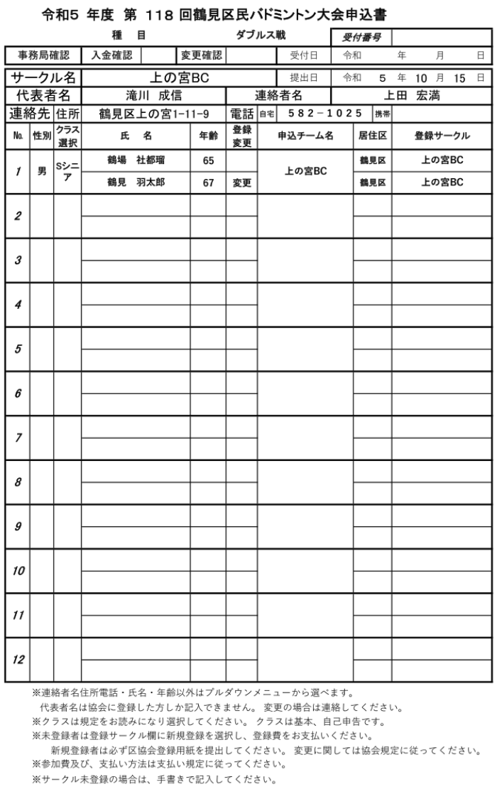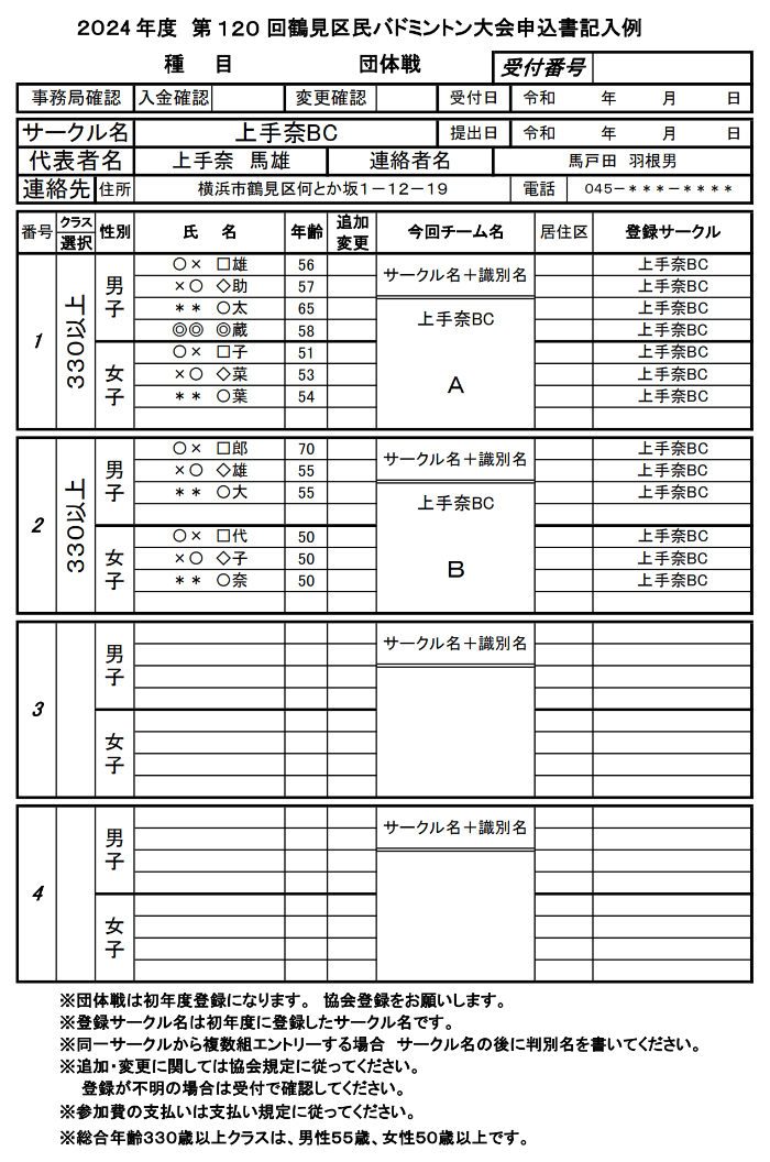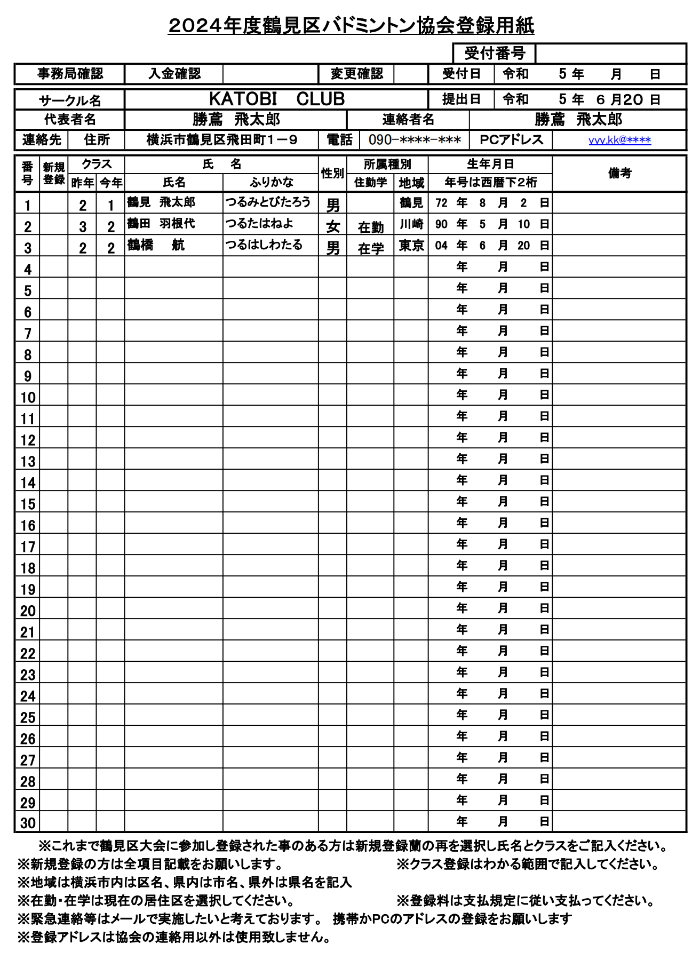 2025年度鶴見区バドミントン協会登録用紙 記入例のダウンロードは、こちらをクリック <35KB>